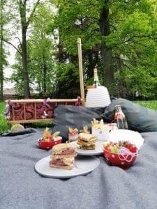 A co je hlavní, skvělý a do detailu promyšlený obsah k snědku či k pití. Třeba ve farmářském variantu najdete domácí rauben anebo caprese sendvič, paštiku ze zámecké kuchyně s čerstvou cibulí, nechybí domácí utopenci a čerstvý chléb a grissini od naší pekařky. Na odlehčení přidáváme čerstvou zeleninu s bylinkovým dipem a neuveřitelně chutný a velice oblíbený coleslaw salát. Protože si naši hosté moc oblíbili chipsy z kořenové zeleniny, přidali jsme je do piknikové nabídky. Sladkou tečkou je krájené ovoce s medovým jogurtem, ovocný puding a džbánek osvěžující domácí limonády. Zda si k pikniku budete přát i flašku skvělého vína z naší vinné karty je už čistě na vás.